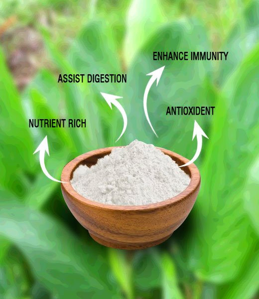 According to Ayurveda, the Arrowroot plant has been traditionally recognized for its healing properties in treating wounds and detoxifying the body. Arrowroot powder is also well-known for its ability to absorb excess oil and sebum on the skin, as well as for promoting a clear and radiant complexion.
